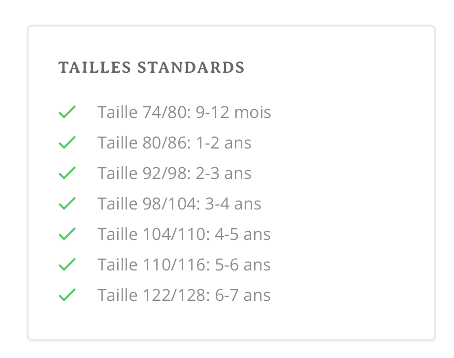Notre recommandation d'âge est fiable à 99 %. À titre de comparaison, nous avons créé un tableau des tailles standard approximatif (correspondant à la marque Naturaline de Coop). Si vous avez encore des doutes sur la taille, n'hésitez pas à nous écrire ; nous serons ravis de vous conseiller. Idéalement, veuillez nous indiquer le tour de taille et la longueur des jambes de votre enfant. Nous vous enverrons volontiers les mesures et d'autres photos du pantalon via Instagram. Vous pouvez également venir voir et essayer le pantalon à Interlaken.