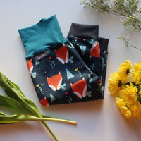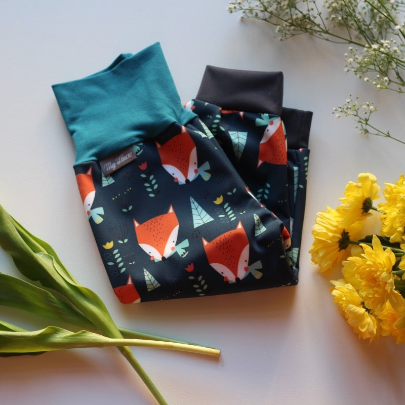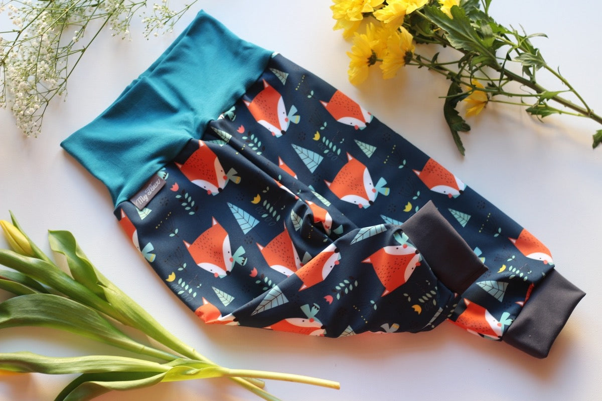 Langlebig: Dank der Säume in der Taille (aus Baumwolle) und an den Hosenbeinen (aus dünnem Softshell), wächst die Hose mit. Der Schritt ist tiefer genäht, damit die Windel genug Platz hat.
