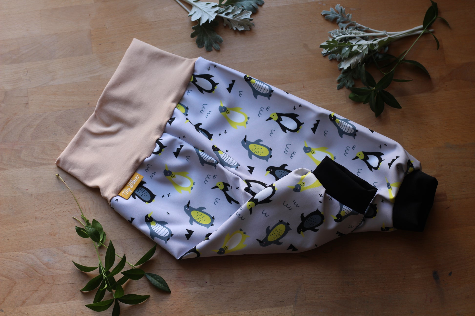Langlebig: Dank der Säume in der Taille (aus Baumwolle) und an den Hosenbeinen (aus dünnem Softshell), wächst die Hose mit. Der Schritt ist tiefer genäht, damit die Windel genug Platz hat.
